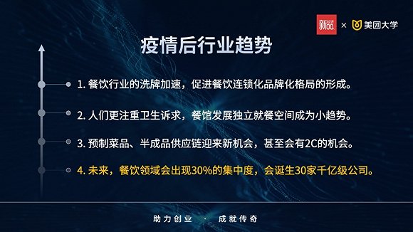 第四,未來(lái)餐飲領(lǐng)域?qū)?huì)出現(xiàn)30%的集中度,會(huì)誕生30家千億級(jí)的公司。